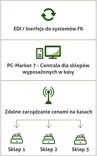 PC-Market 7 z modułem do zdalnego zarządzania cenami na kasach przeznaczony jest dla sieci sklepów wyposażonych wyłącznie w kasy. W sklepach nie ma komputerów na zapleczu - komputer z programem PC-Market 7 jest umieszczony w Centrali sieci lub w jednym ze sklepów. Kasy komunikują się z centralą poprzez modemy lub poprzez sieć rozległą (Internet). W sklepie może pracować jedna lub więcej kas - w programie istnieje możliwość grupowania kas.